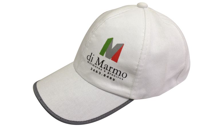 Modelo seis gomos serigrafado e com viés na aba. Opções de fechamento em fivela de metal, velcro ou regulador de plástico. Tamanhos: adulto e infantil